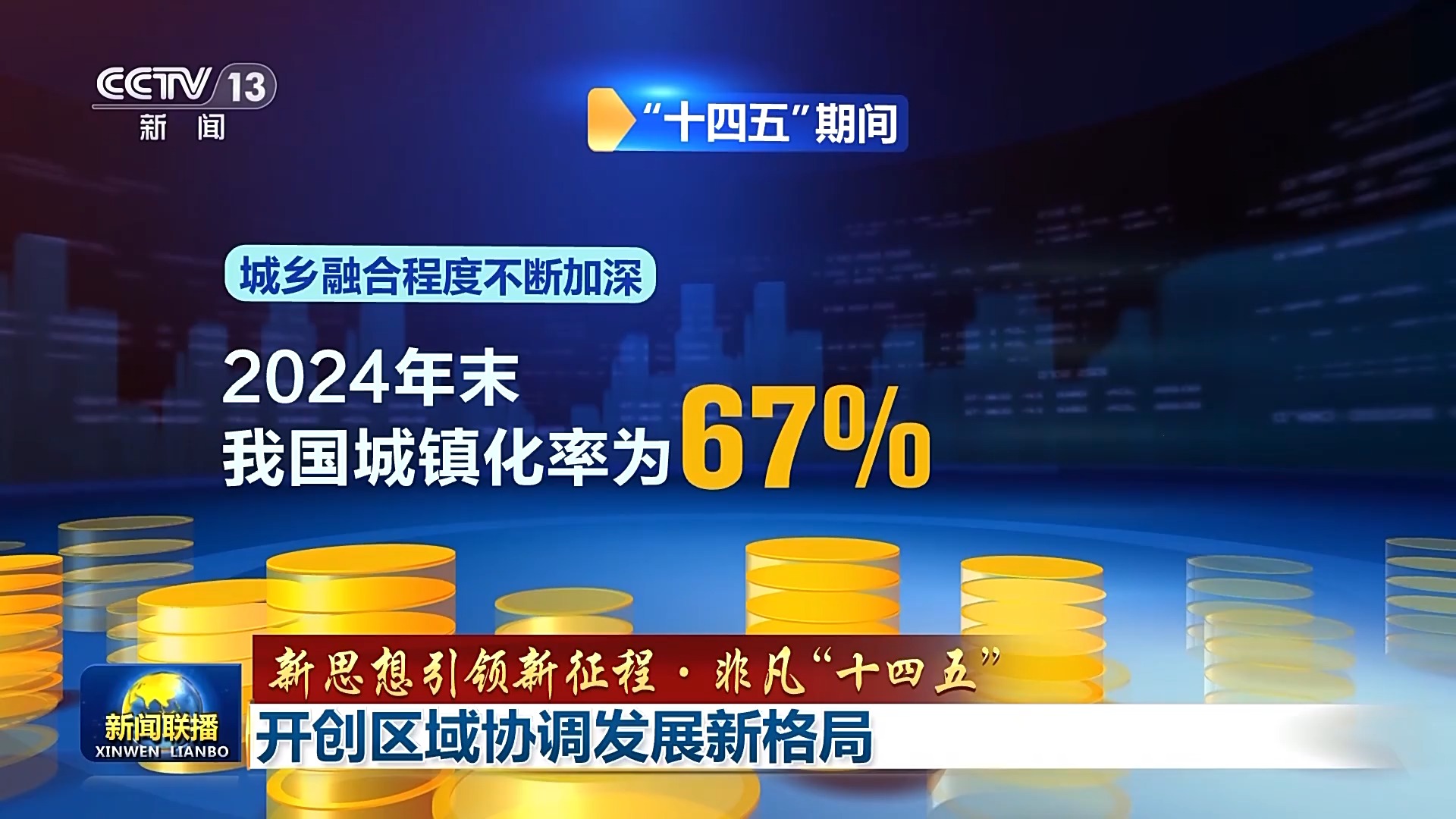 “十四五”期间,城乡融合程度不断加深。2024年末,我国城镇化率为67%,比2020年末提高3.11个百分点;城乡居民收入差距不断缩小,农村居民人均可支配收入年均实际增长6.9%,增速比城镇居民高2.4个百分点。