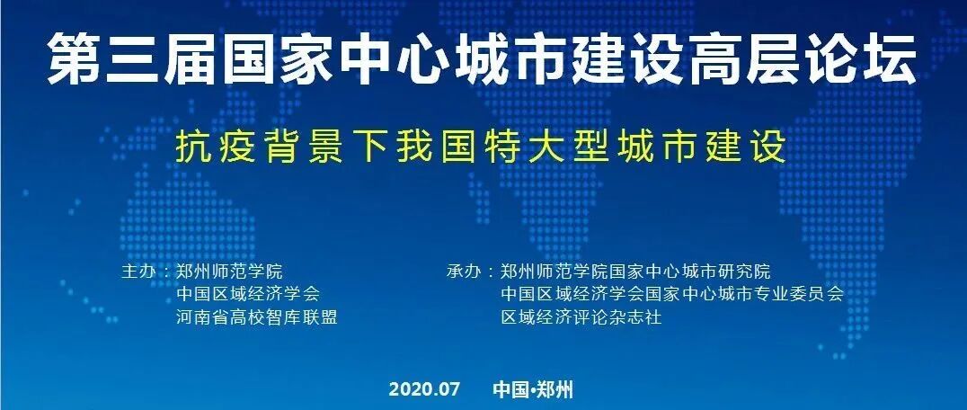 2020年7月10日,第三届国家中心城市建设高层论坛以网络视频方式顺利召开。本届高层论坛以“抗疫背景下我国特大型城市建设”为主题,由中国区域经济学会、郑州师范学院、河南省高校智库联盟联合主办;中国区域经济学会国家中心城市专业委员会、郑州师范学院国家中心城市研究院、《区域经济评论》杂志社承办。